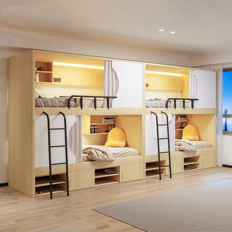 常見為二連體、三連體這兩種款式,分別運用于四人間宿舍和六人間宿舍。這種公寓床的優點是儲物空間大、學習空間大,休息區與學習區相互獨立又相互結合,功能齊全。并且隱私性較好,配備上隱私簾后就可以成為個人空間,是當前各學校、企業購買的一種主流宿舍床。