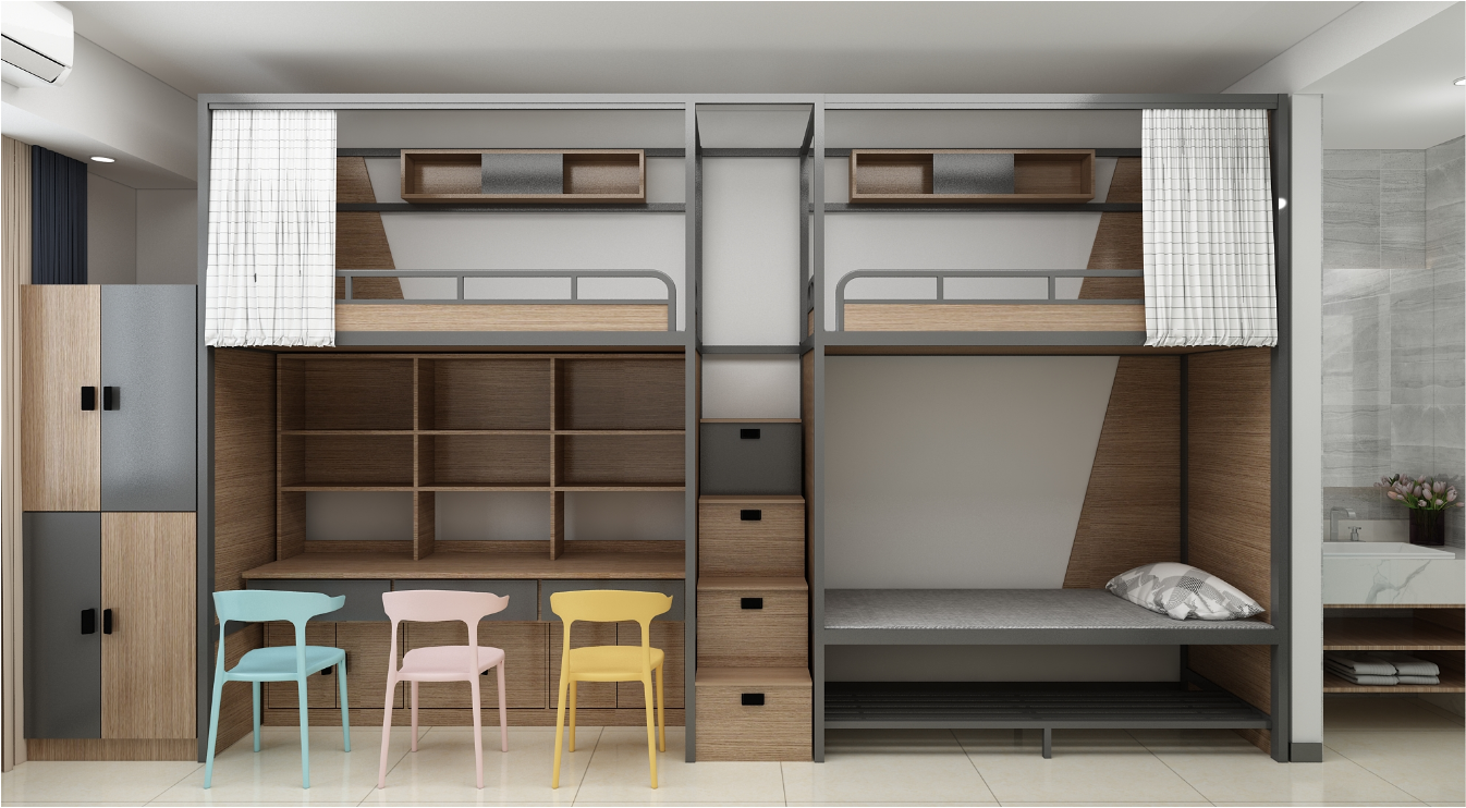 高中學(xué)校宿舍的標(biāo)準(zhǔn)配置通常包括上下鋪鐵床、儲(chǔ)物柜和桌椅。雖然這些組件的總價(jià)與兩連三位學(xué)生宿舍床相近,但傳統(tǒng)的配置對(duì)宿舍空間的需求更大。額外的空間建設(shè)費(fèi)用并非小數(shù)目,可能會(huì)增加數(shù)百甚至數(shù)千元的支出。